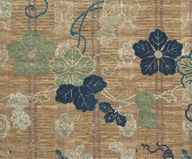 A Framed Japanese Antique Obi: 62½ x 14¾ inches. Brocade textile Obi framed under glass in a black painted frame overall 64 x 15-1/2 in. Silk and gold threads. Condition: Not inspected out of the frame.