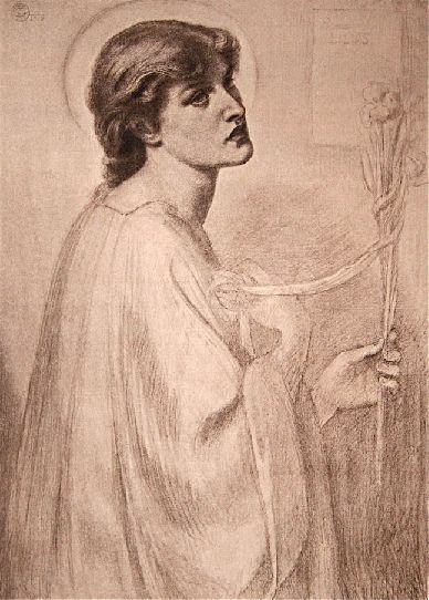 This is a work on paper print, "Sancta LILIAS." by artist D G Rossetti: