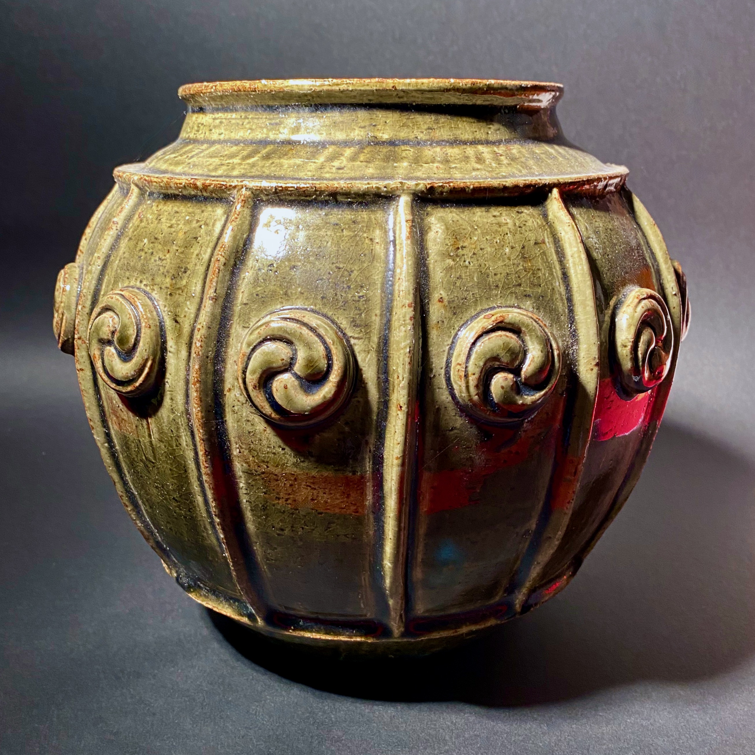 This is a stunning antique Chinese ceramic decorative pottery plant pot from the 1930s to 1960s. It features a wonderful green color and patina, and is in very good condition. The pot measures approximately 8 1/2 x 8 1/2 and was h more..