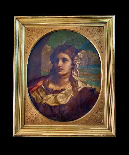 This is a fascinating 19th-Century French Antique Victorian Liberty Portrait Oil Painting on canvas. Framed in an 1800s gold gilded and engraved oval frame.