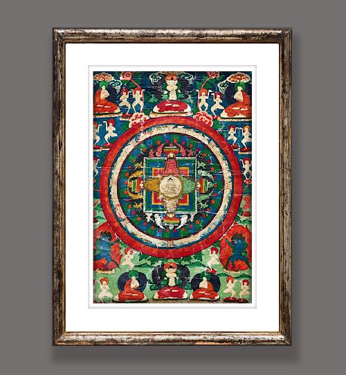 Sino-Tibetan Bodhisattva Avalokiteshvara Thangka 15 ½" x 11" original image Of rectangular form silk Thangka, the central hand-painted image was stitched with several textile and silk borders, with a rod and a string fo more..
