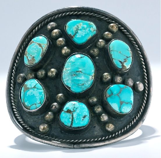 A true collector's item, this American Indian bracelet features five turquoise stones beautifully offset in sterling silver. This is a great bold color for a bracelet that makes a statement. The distinctly Southwestern styli more..