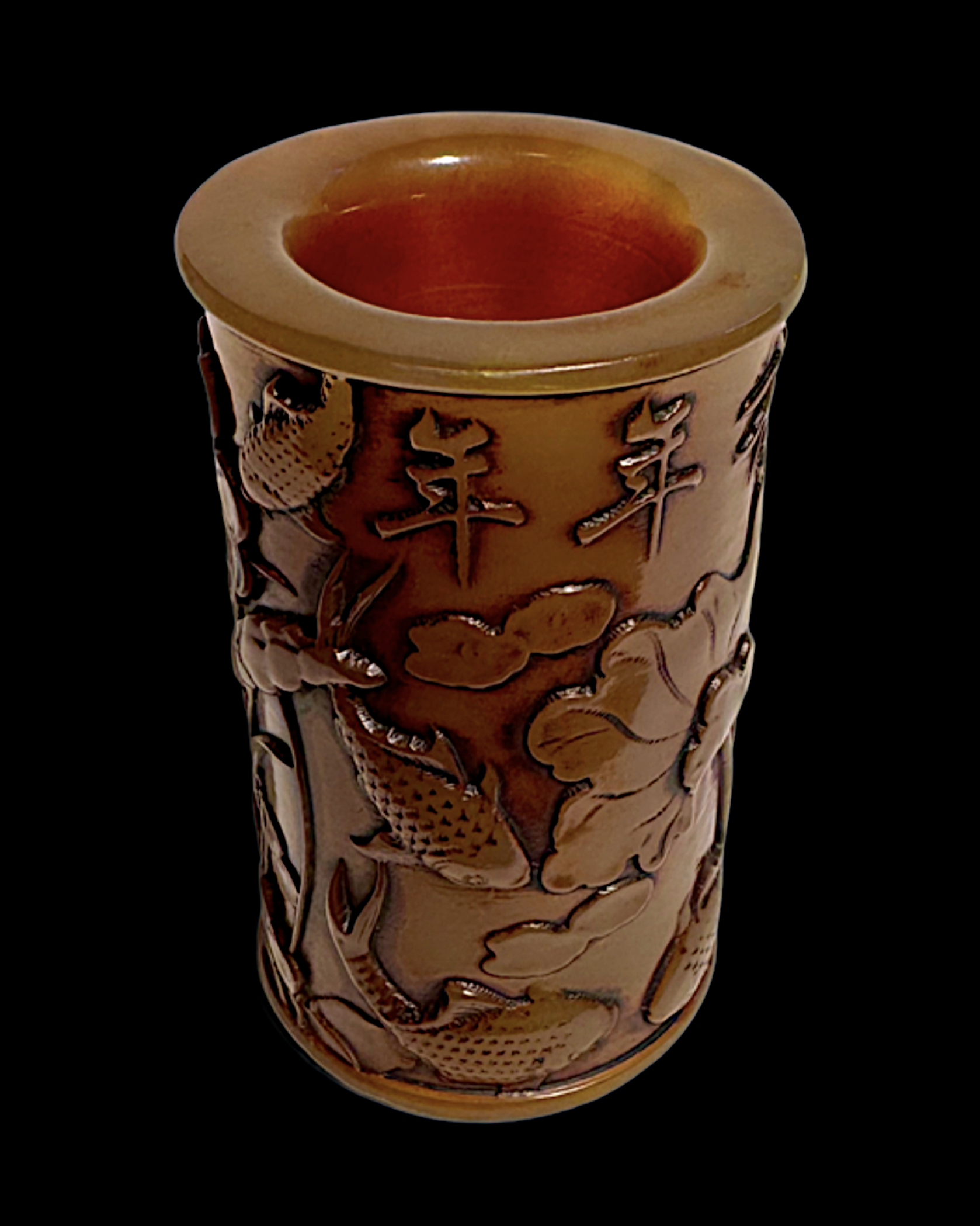 Antique hand-carved amber stone jade brush holder. This exquisite piece features finely detailed carvings by a Chinese craftsman depicting carp fish swimming through a watery, beautiful pond landscape that surrounds the container. more..
