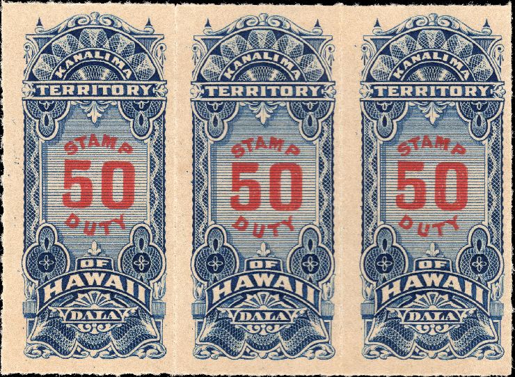 A very rare strip of 3 50 Dollar revenue stamps from the Territory of Hawaii. Very short lived as they were replaced by American stamps later. Printed by the American Banknote Company. Based on the design of the Kingdom of Hawaii more..