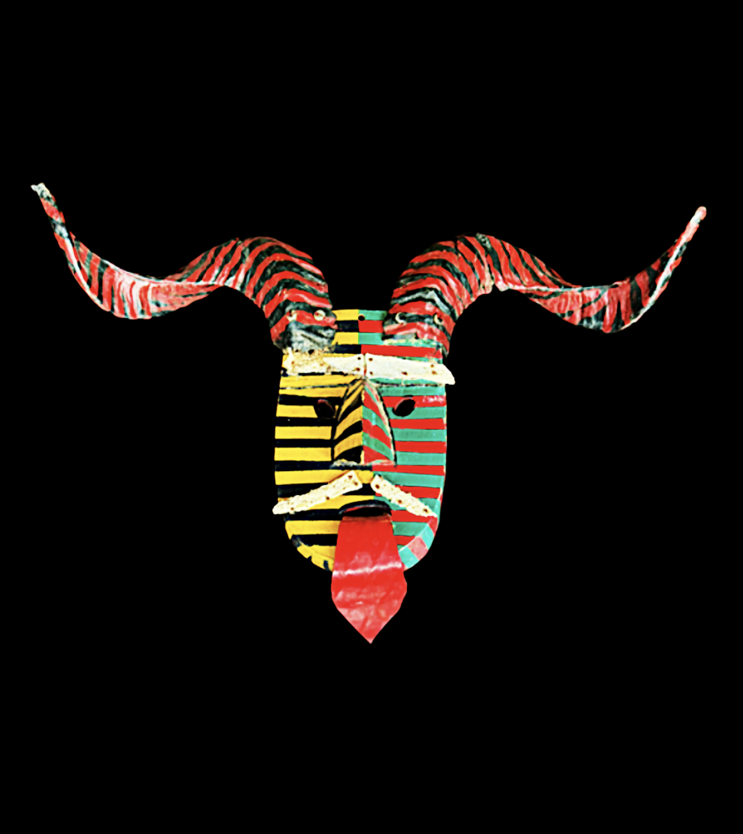 Fabulous 20th-century Mexican antique Arts and Crafts carnival mask, hand-carved from wood with goat horns, a red tongue, and vibrant, original painted geometric details crafted from found objects. Approximate size 24 inches wide more..