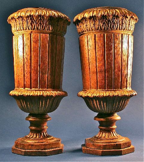 Early 19th Century Pair of hand carved Italian gilt wood fluted urns with classic antique swag and carved detailing. Gold painted finish. Perfect old planters for your every need in our extensive collection. Whether you want to more..