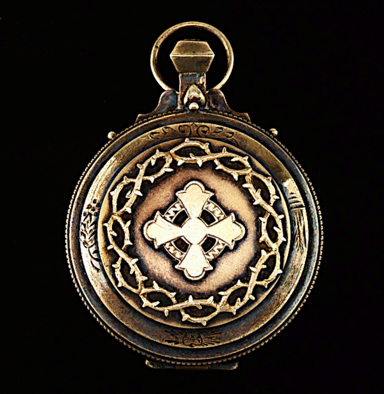 Antique Victorian Irish Silver Photographic Keepsake Christian Locket: 1 ¾"D, unmarked silver with a hinged design; overall weight 30.3 gm. Condition: Tarnish from age. During the Victorian period, many women wore necklaces more..