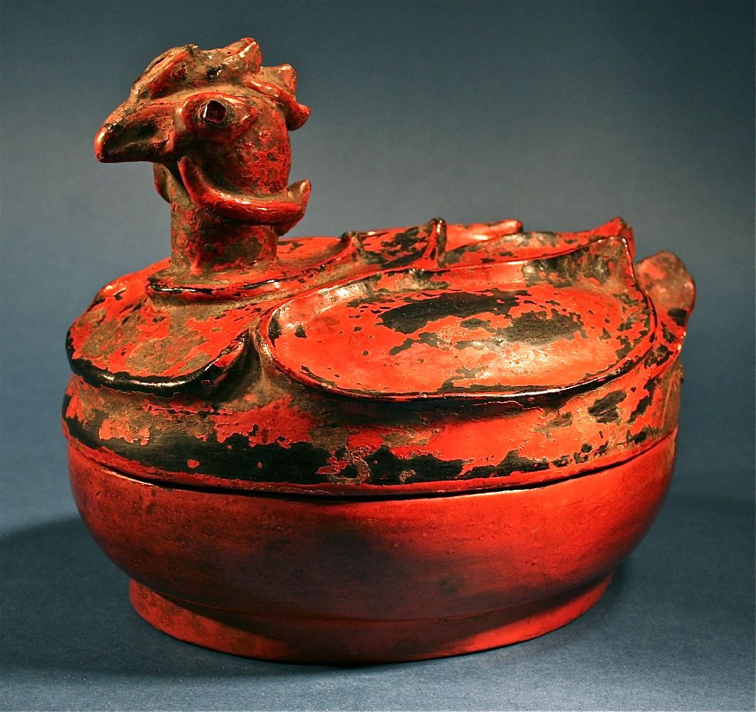 This is an exquisite example of a finely old carved painted wooden lacquer covered box in the form of a roosting hen. The lacquer is carved in fluid detail. It is carved in an abstracted foliate motif. Designed in a detailed geom more..