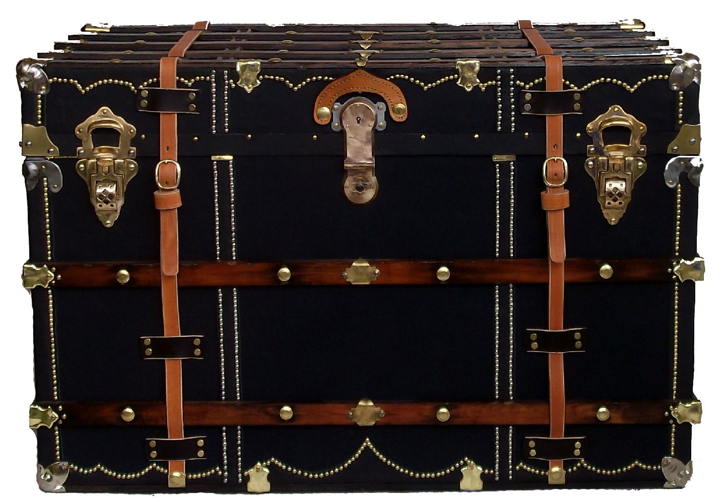 🔥 Consignment 🔍 We need to check the availability 🌈 Large antique packing trunk with ornate brass and nickel plated tack head design. Oversized solid brass draw bolts, brass plated slat clamps, solid brass YAYLE & more..