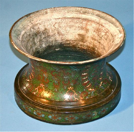This is a beautiful vintage large bronze and cloisonne Chinese stand. The body of the pot is imprinted with a geometric pattern and there is a band of cloisonne with designs against a green background which runs around the pot. T more..