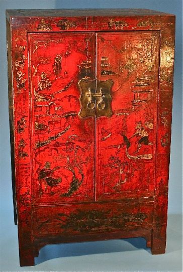 Gorgeous, One of the best Chinese antique wooden cabinets I have seen. Red and black lacquered in red with hand painted gold design. Chinese red lacquered and gilt decorated table cabinet, 19th century. with original red & gil more..