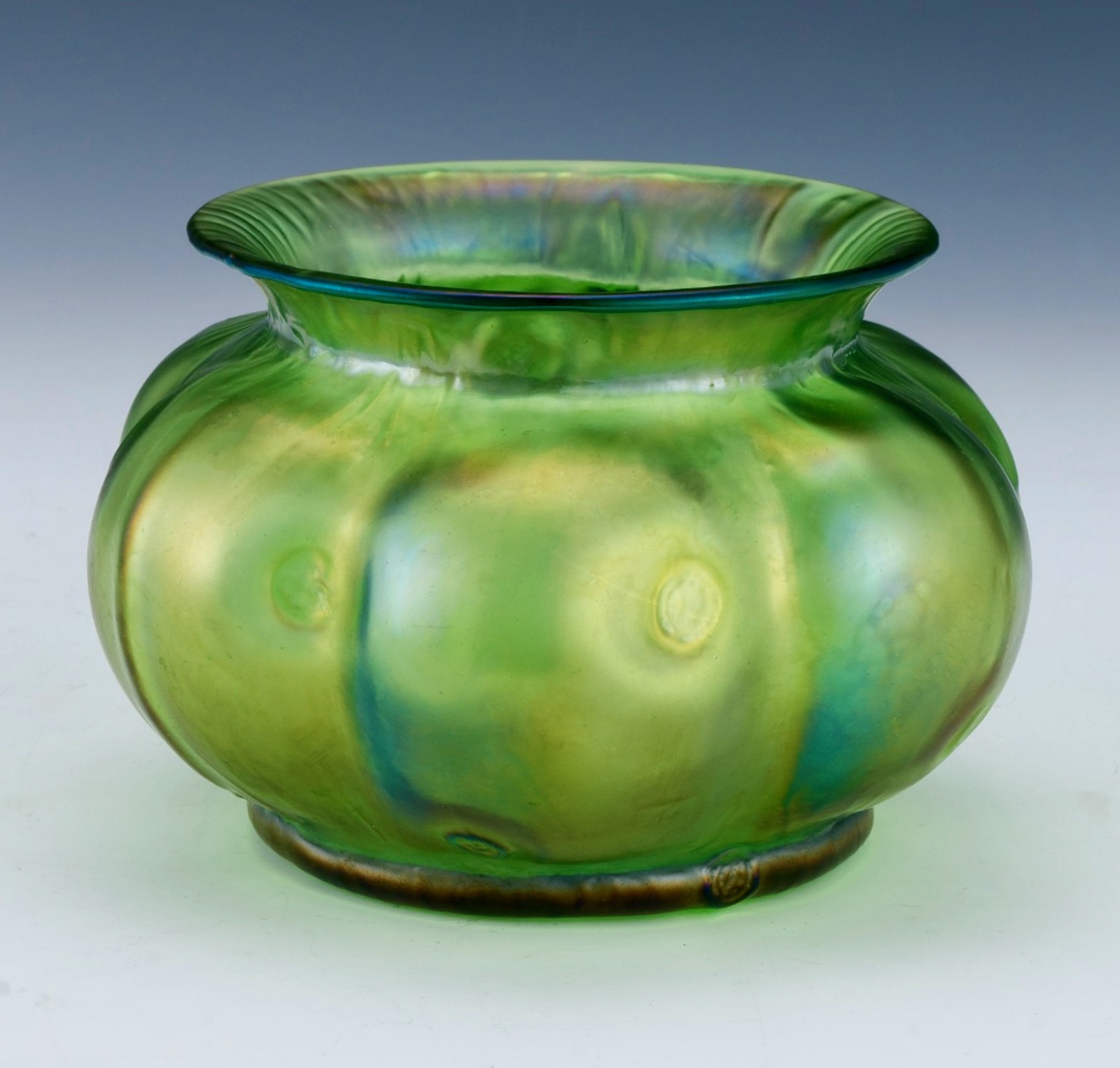 Antique Art Nouveau Arts and Crafts Loetz Squat-Form Glass Vase Dimensions: 4 ¼" H x 6 ¾" W.